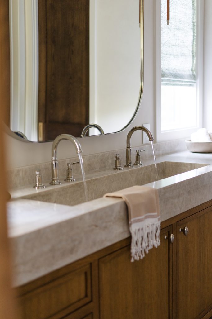 For the primary bath, the goal was simple: calm, serene, and elegant. We wrapped the room in warm neutrals and layered in refined materials like the honed quartzite integrated sink, polished nickel fixtures, and a custom White Oak vanity.