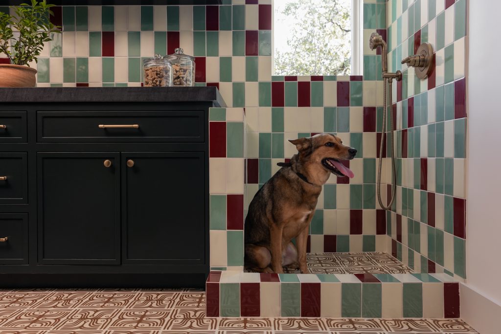 - A dog shower for muddy paws that features a seamless Infinity Drain Premium Tile-In Center Drain
