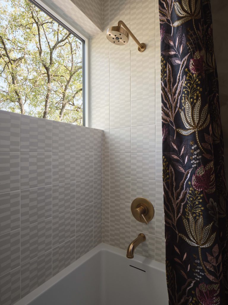 This bathroom sits among the treetops, so I wanted it to feel airy and grounded at the same time. Soft greens, a grid-pattern floor, and warm brass accents give it a warm, modern feel. The custom steam shower brings the ultimate spa feel to this cozy retreat spot.