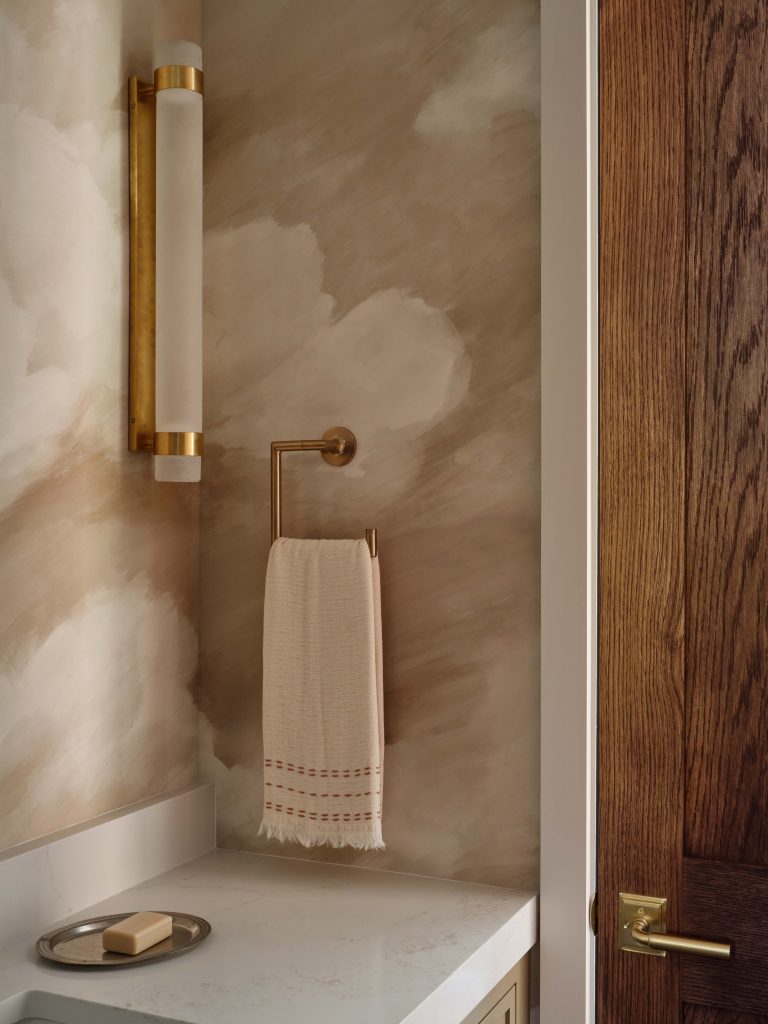 This bathroom is wrapped in a soft, cloudlike mural that shifts with the light. Featuring a custom floor-to-ceiling shower curtain and an extra deep soaking tub from Americh, this is a spot for ease and sophistication for any visitor.
